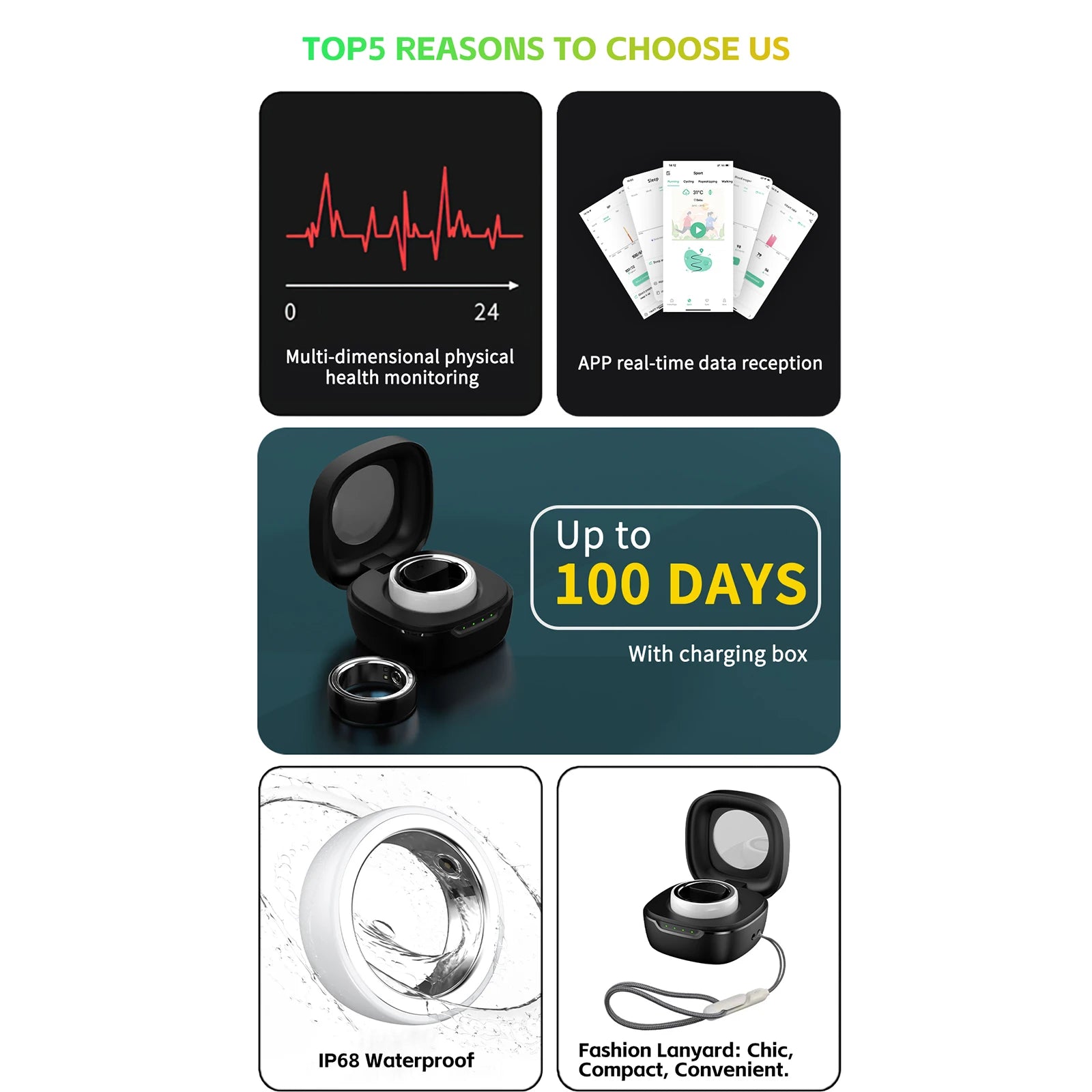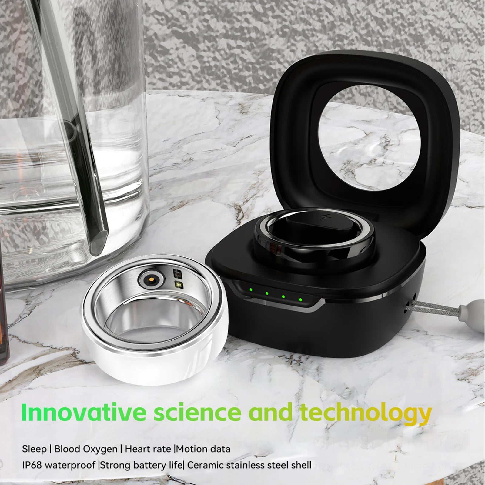 Long-lasting battery life: With a charging box, it can be used continuously for 100 days, the ring can be used for 7 days at a time, and the charging box can be charged 20 times.